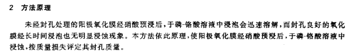 阳极氧化膜封孔质量的检测方法通常可以采用酸溶解法,经硝酸预浸后,在磷铬酸溶液中浸蚀,按质量损失评定其封孔质量的方法。