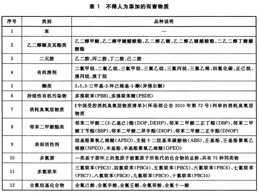 4. 2. 2. 3产品中不得人为添加的有害物质见表1 。