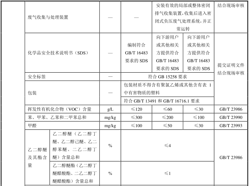 5.3 环境属性中颗粒物回收装置、 废气收集与处理装置、 化学品安全技术说明书、 安全标签、 包装、 生物杀伤剂含量、 沥青、 光稳定剂通过提交证明文件结合现场检查的方式进行评价。