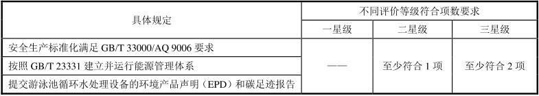 游泳池循环水处理设备评价指标包括资源属性指标、能源属性指标、环境属性指标和品质属性指标。游泳池循环水处理设备评价指标要求见表2。