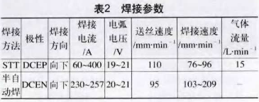 (4)焊接参数 焊接之前需要预热,温度为100-200度,焊接方法为STT根焊、自保护药芯焊丝半自动焊填充、盖面,焊接试验的焊接参数为表格2所示。