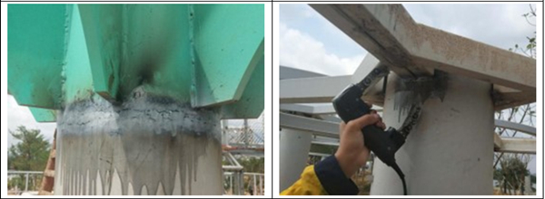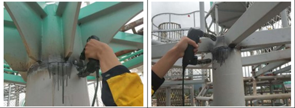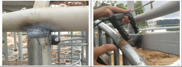 磁粉探伤时,先要对受检表面进行清洁和干燥处理,要求表面不得有油脂、铁锈、氧化皮或其它粘附磁粉的物质。一般以打磨处理为主,打磨后要求工件表面粗糙度R3<=25um。在对工件进行灵敏度测试合格后可对工件进行磁化检测,磁化时间一般为0.5~2s,同时施加适量的磁悬液,应保证磁粉浓度均匀,并在停施磁悬液至少1s后方可停止磁化。建议对每个受检区域应进行两次90度方向的交叉磁化检测,以降低漏检率。检测过程中发现缺陷磁痕显示,可用透明胶带纸粘下磁痕,将其作为记录保存,用以评定焊缝缺陷程度。检测部位所处环境光线较昏暗或者观察条件不佳,可采用灵敏度更高的荧光磁粉。< span="">