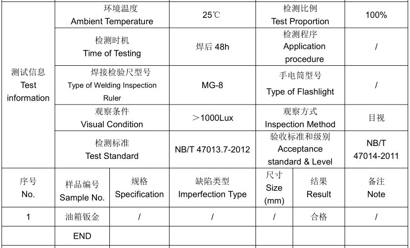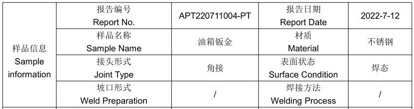 一、样品信息:不锈钢油箱钣金VT目视检测-无损探伤NB/T47013.2-2012