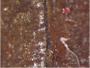 标记1处内表面:深色斑块中有一条贯穿的长直条缺陷,该缺陷底部观察到有斜坡往一侧内部延伸,不属于划伤痕迹,放大观察发现沿缺陷底部和缺陷旁一处有孔隙存在。