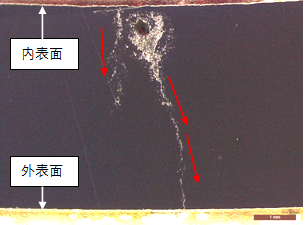 标记1处横截面:有一条贯穿内外表面的裂纹,近内表面有大量腐蚀产物,贯穿裂纹左边可见一条未贯穿裂纹,起于内表面往外表面延伸,见图7。裂纹扩展方向如图7所示红色箭头方向。