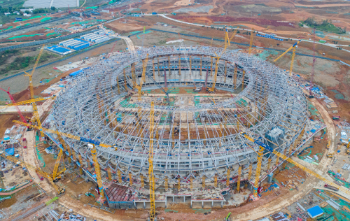 成都市东安湖体育公园主体育场,是2021年第31届世界大学生夏季运动会的开闭幕式以及赛事用体育场。总建筑面积12万平方米,高50米,可容纳4万名现场观众,用钢量达到1.4万吨。该体育场是国内少有的正圆形体育场,为保证未来体育场的综合使用效率及观众舒适度,体育场观众席上方是一个由四周向圆心聚合成环状的钢结构顶棚,工程难度大,施工精度堪称苛刻。
