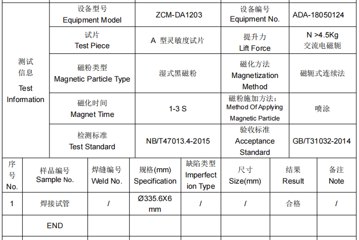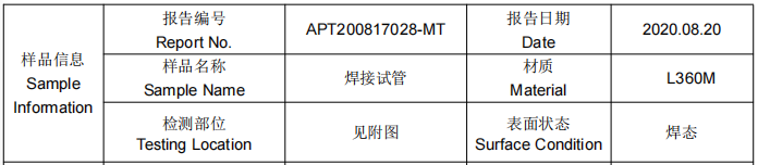 一、样品信息:L360M低合金钢管MT磁粉探伤-NB/T47013.4-2015