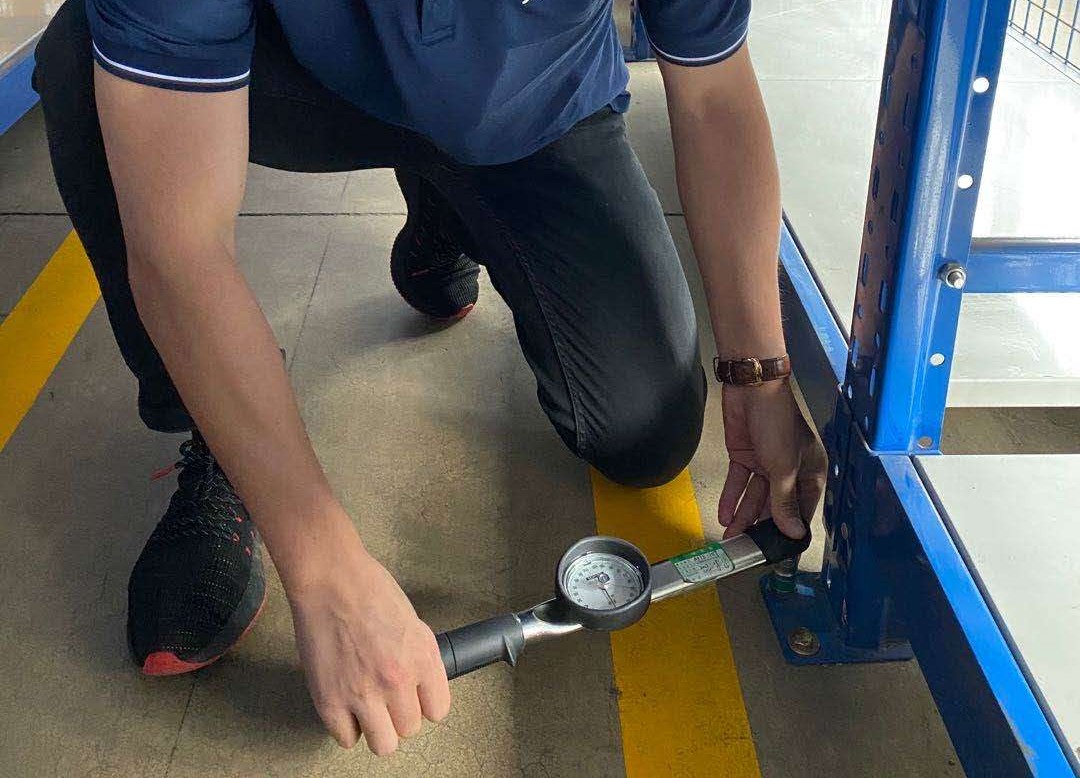 根据图片所示,广州安普检测第三方货架检测工程师采用是“表盘式力矩扳手”,测量装配后的中型货架立柱脚底螺栓的力矩,测量螺栓拧紧的质量,这种方法只能采用人工操作,所以一般采用抽检方式(图);货架底脚与地面连接的稳定性数据是货架结构整体稳定性的重要保障。柱基板与立柱的连接方式是由底脚螺栓连接,脚底螺栓若是没有和柱基板牢牢连接,对货架的立柱垂直的稳定性造成不稳的现象,脚底螺栓失效是对货架立柱失稳因素之一。