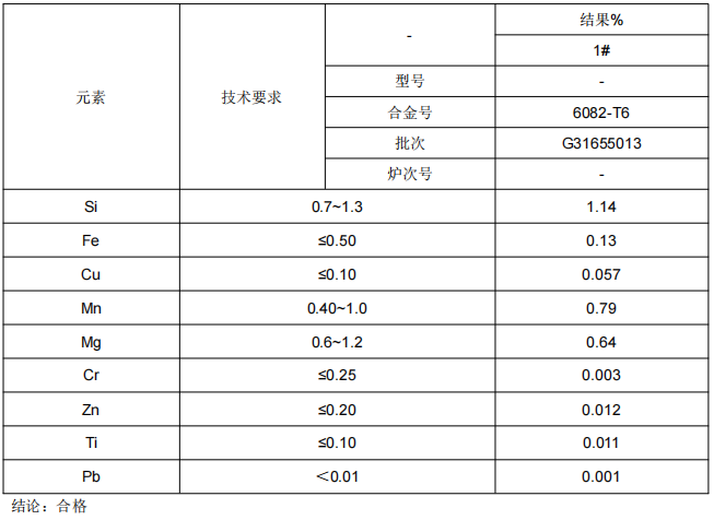 1、6082铝板材成分鉴定:通过仪器分析手段确定样品的成分及其比例后,通过对照所提供的材料牌号对应标准的要求,判定其是否符合标准要求。