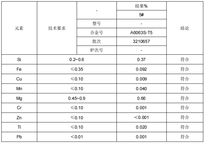 1、铝合金铝管A6063成分鉴定:通过仪器分析手段确定样品的成分及其比例后,通过对照所提供的材料牌号对应标准的要求,判定其是否符合标准要求。