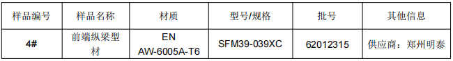 2、前端纵梁型材铝合金牌号检测:通过仪器分析手段确定样品的成分及其比例后,查找对应该材料类型的标准,为客户推荐与该材料成分含量最接近的牌号。牌号推荐可以为客户提供一定的应用参考信息。