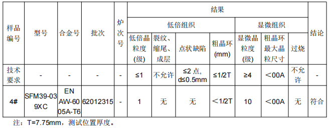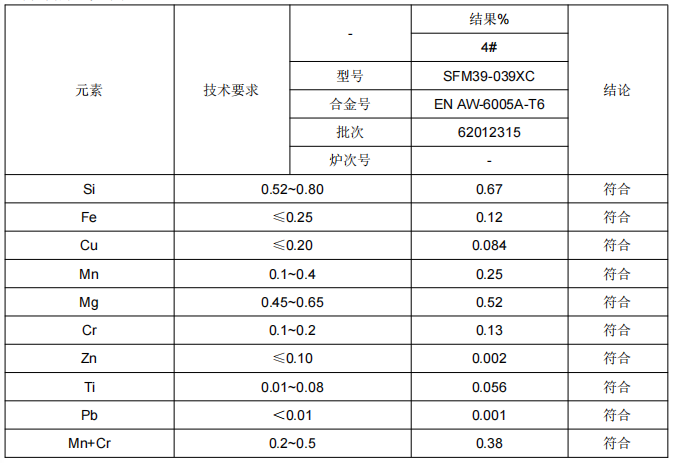 1、前端纵梁型材铝合金成分鉴定:通过仪器分析手段确定样品的成分及其比例后,通过对照所提供的材料牌号对应标准的要求,判定其是否符合标准要求。