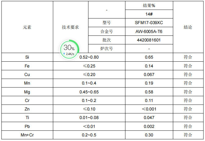 1、保护套管铝合金成分鉴定:通过仪器分析手段确定样品的成分及其比例后,通过对照所提供的材料牌号对应标准的要求,判定其是否符合标准要求。