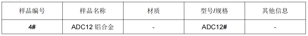 1、ADC12 铝合金成分分析:通过仪器分析手段确定样品的成分及其比例后,通过对照所提供的材料牌号对应标准的要求,判定其是否符合标准要求。