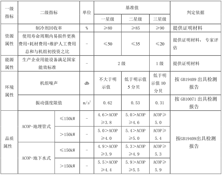 5.2 按照 4. 1 基本要求和 4. 2 评价指标要求开展第三方评价, 采用符合性评价方法, 分为一星级、 二星级、 三星级 3 个等级。 对于地热能交换系统和水(地) 源热泵机组, 3 个等级的绿色建材均应满足所有基本要求, 并根据对某一评价等级的全部评价指标要求满足情况, 最后确定为一星级、 二星级、 三星级。 对于地源热泵系统评价则取地热能交换系统和水(地) 源热泵机组分别满足星级标准中较低者, 作为系统星级。