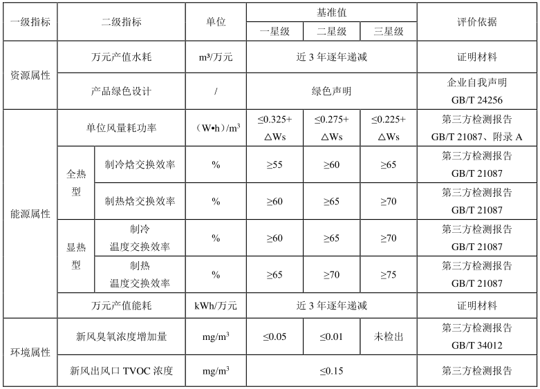 新风净化系统评价指标包括资源属性指标、 能源属性指标、 环境属性指标和品质属性指标。 不带热回收功能新风净化系统指标应符合表2的要求; 带热回收功能新风净化系统应符合表3的要求。