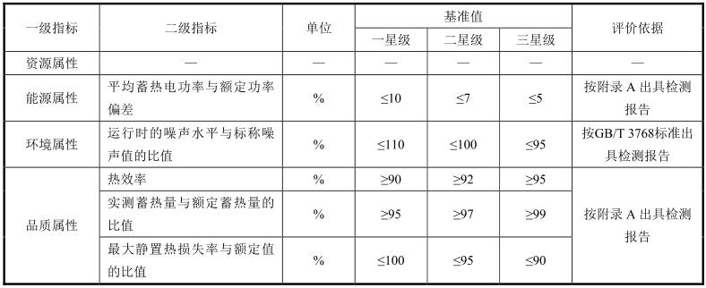 建筑用蓄能装置评价指标包括资源属性指标、 能源属性指标、 环境属性指标和品质属性指标。 蓄热型电加热装置的评价指标要求见表2, 相变蓄冷蓄热装置的评价指标要求见表3, 蓄热式电采暖散热器的评价指标要求见表4。