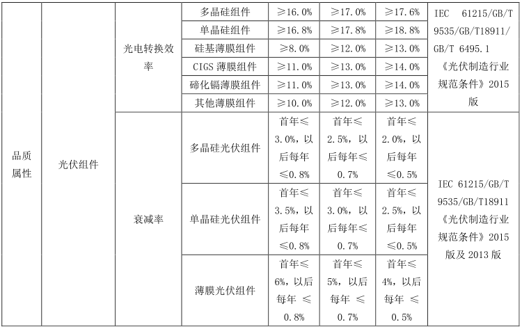 5.5 品质属性中光伏组件的转换效率及衰减率分别按 IEC 61215/GB/T 9535/GB/T18911/GB/T 6495. 1 及《光伏制造行业规范条件》 2015 版规定进行评价。