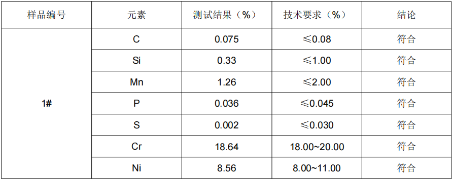 结论:结果符合 GB/T 20878-2007 中牌号 06Cr19Ni10(304)的成分要求。