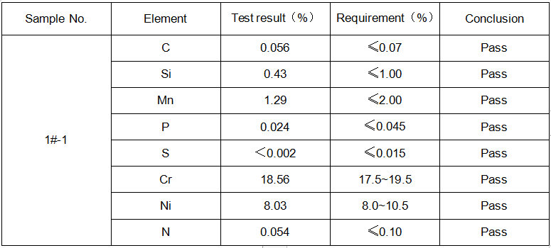 Conclusion: The result complies with EN 10088-2:2014 the type X5CrNi18-10(304)