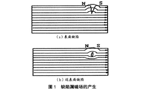图1所示,铁磁性材料工件被磁化后,若在工件表面或近表面存在裂纹等缺陷,那么缺陷处的磁感应线会发生局部畸变,形成一个楼磁场,此漏磁场将吸引、聚集检测过程中施加的磁粉,从而形成可目视的磁痕,既缺陷显示。