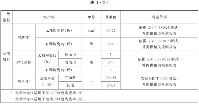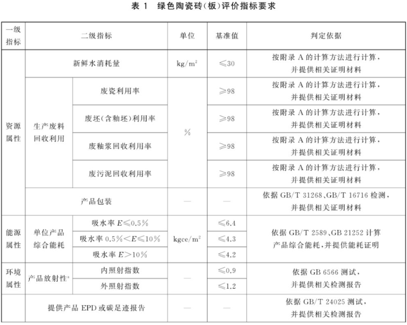 指标体系由一级指标和二级指标组成。一级指标包括资源属性指标、能源属性指标、环境属性指标和品质属性指标。绿色陶瓷砖(板)产品应符合表1的要求。