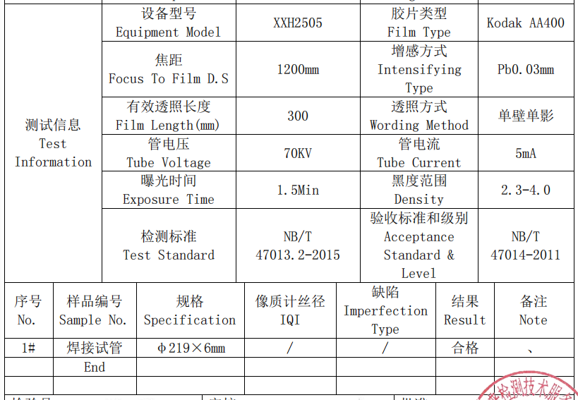 二、射线探伤测试信息: