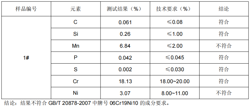 一、电机轴SUS304不锈钢成分分析:通过仪器分析手段确定样品的成分及其比例后,通过对照所提供的材料牌号对应标准的要求,判定其是否符合标准要求。