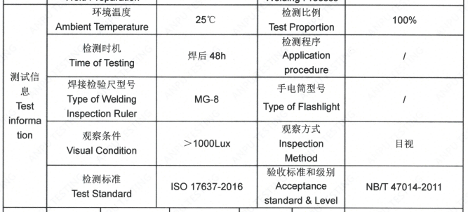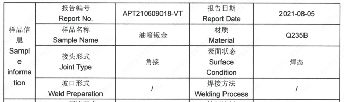 一、样品信息:Q325B油箱钣金VT目视检测-检测标准ISO17637-2016