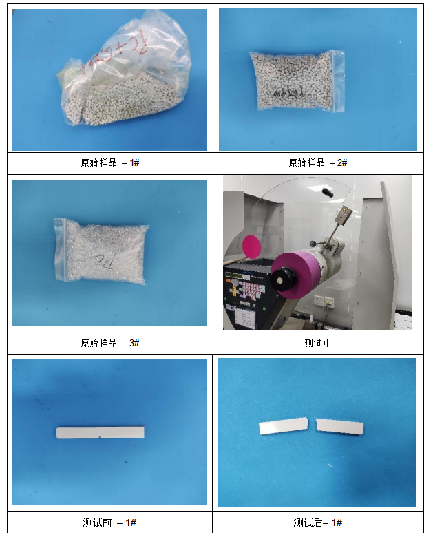 测试项目1:PC+10%GF悬臂梁缺口冲击强度测试、PBT+30%GF悬臂梁缺口冲击强度测试、透明PC悬臂梁缺口冲击强度测试