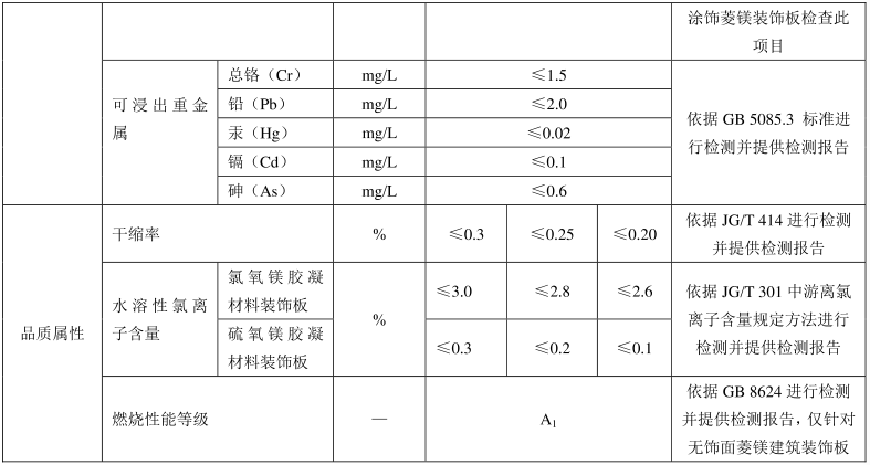 4.1.8 镁质新型装饰材料应满足 JC 688、 JG/T 414、 SB/T 10845 等现行行业标准的要求。