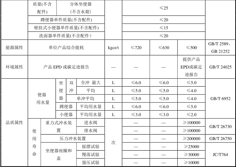 5.5 品质属性中便器用水量指标应在满足产品冲洗功能的前提下按GB/T 6952规定进行评价。 便器配件的使用寿命按GB/T 26730、 GB/T 26750、 JC/T 764等标准规定进行。