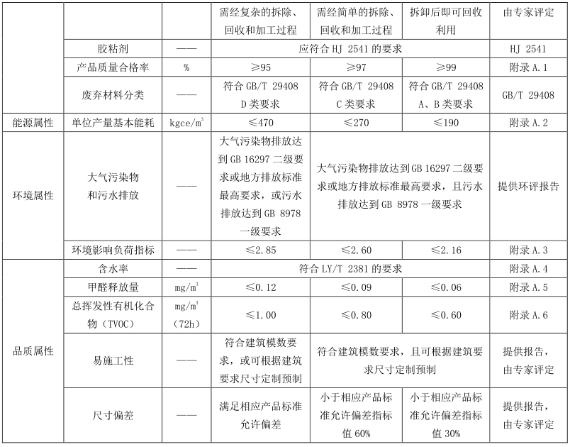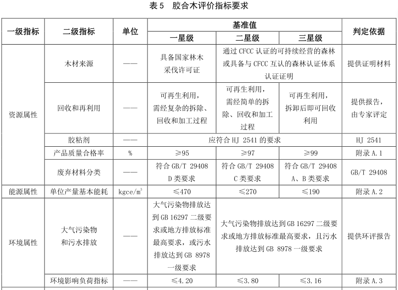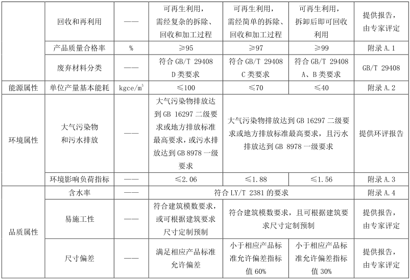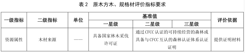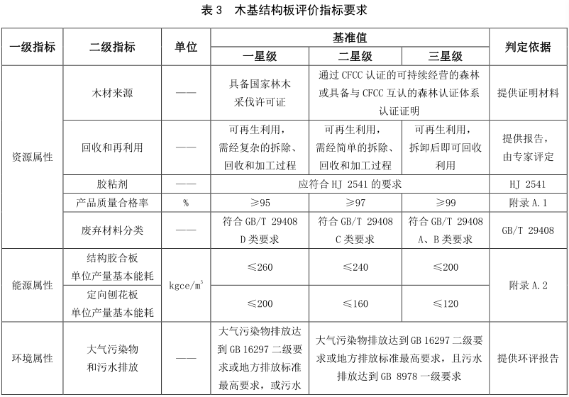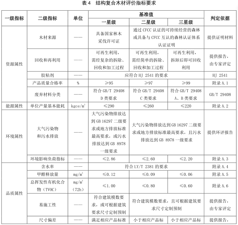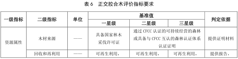 现代木结构用材评价指标包括资源属性指标、 能源属性指标、 环境属性指标和品质属性指标。 原木方木、 规格材的评价指标要求见表2, 木基结构板的评价指标要求见表3, 结构复合木材的评价指标要求见表4, 胶合木的评价指标要求见表5, 正交胶合木的评价指标见表6。