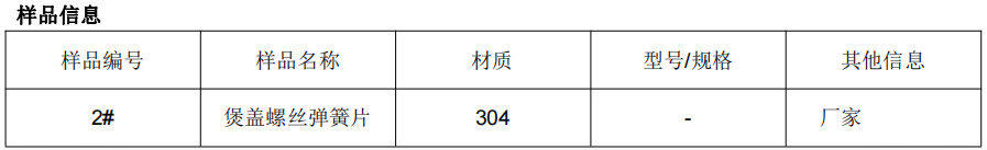 一、煲盖螺丝弹簧片304不锈钢成分鉴定:通过仪器分析手段确定样品的成分及其比例后,通过对照所提供的材料牌号对应标准的要求,判定其是否符合标准要求。