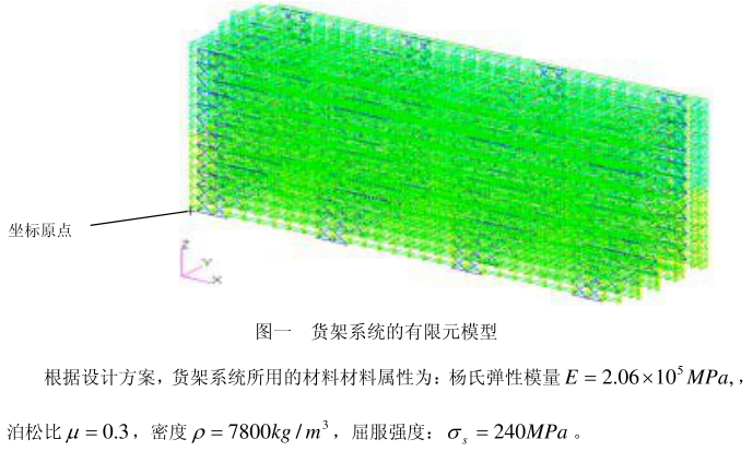 横梁式货架的有限元模型在 MSC. Pat r an 20 01 中完成。在建模时以立柱的中心线为基准,认为各构件之间的连接为固接方式, 根据已知条件建立的有限元模型如图一, 图中“+”为坐标原点。 单元类型均采用两节点梁单元(CBAR) , 每个单元共有 9 个自由度, 可承受弯曲、 扭转、 拉压载荷。 完成的有限元模型共有 3 1 1 63 个节点, 61 555 个单元。(图一 横梁式货架系统的有限元模型)