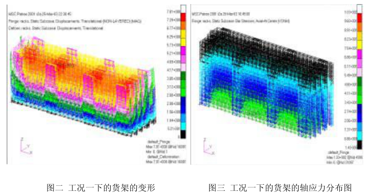 货架的轴应力见图三,其最大值为103MPa,发生在节点4399处,它的坐标位置式(25690,2800,0)。根据色带可以看出,较大的应力分布点在货架立柱的下端处,这与理论上的定性分析是一致的。所用材料的屈服强度为240MPA,因此这个应力值是相对较小的。